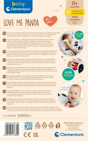 Clementoni Love me Panda yra interaktyvus žaislas, tinkantis tiek berniukams, tiek mergaitėms nuo 0 metų. Jį galima plauti rankomis, todėl jis tinka naudoti tiek viduje, tiek lauke.